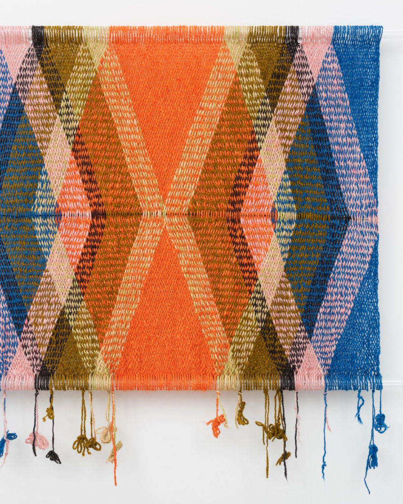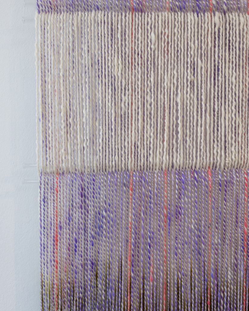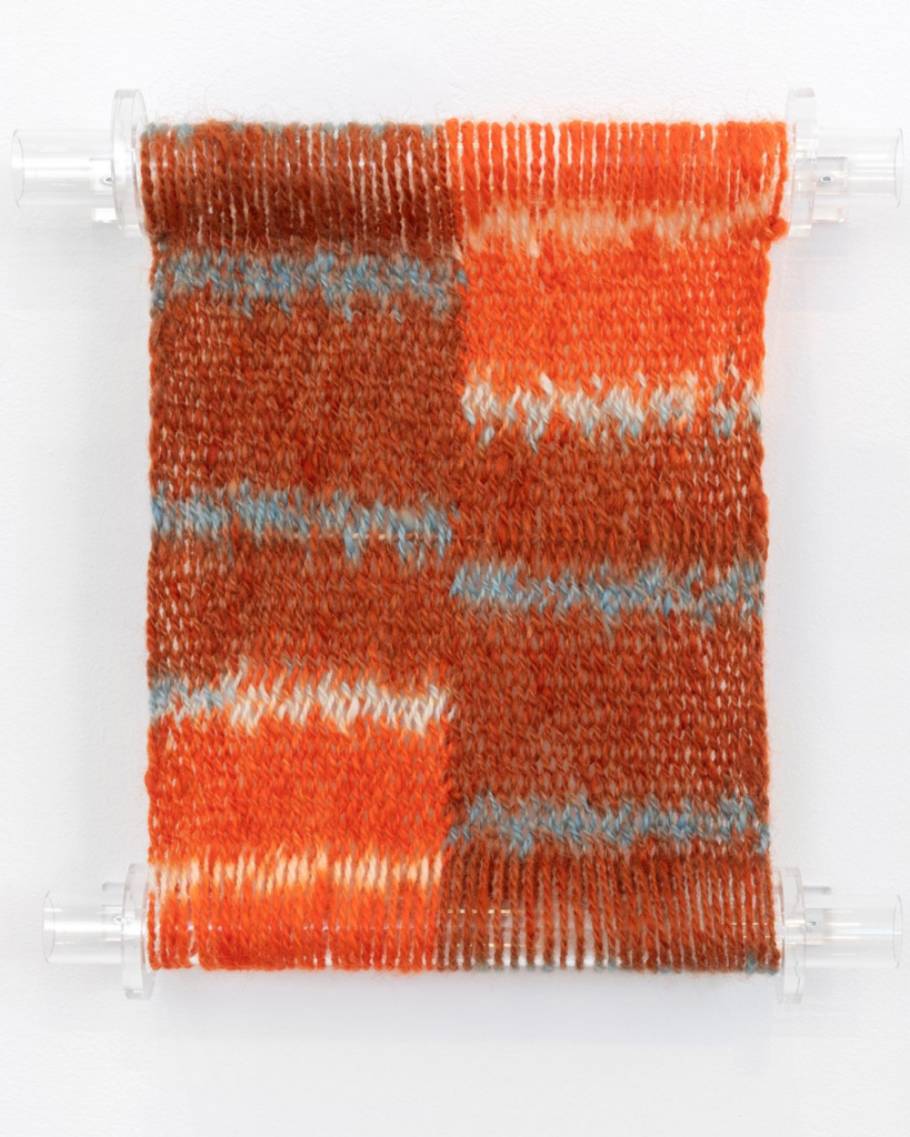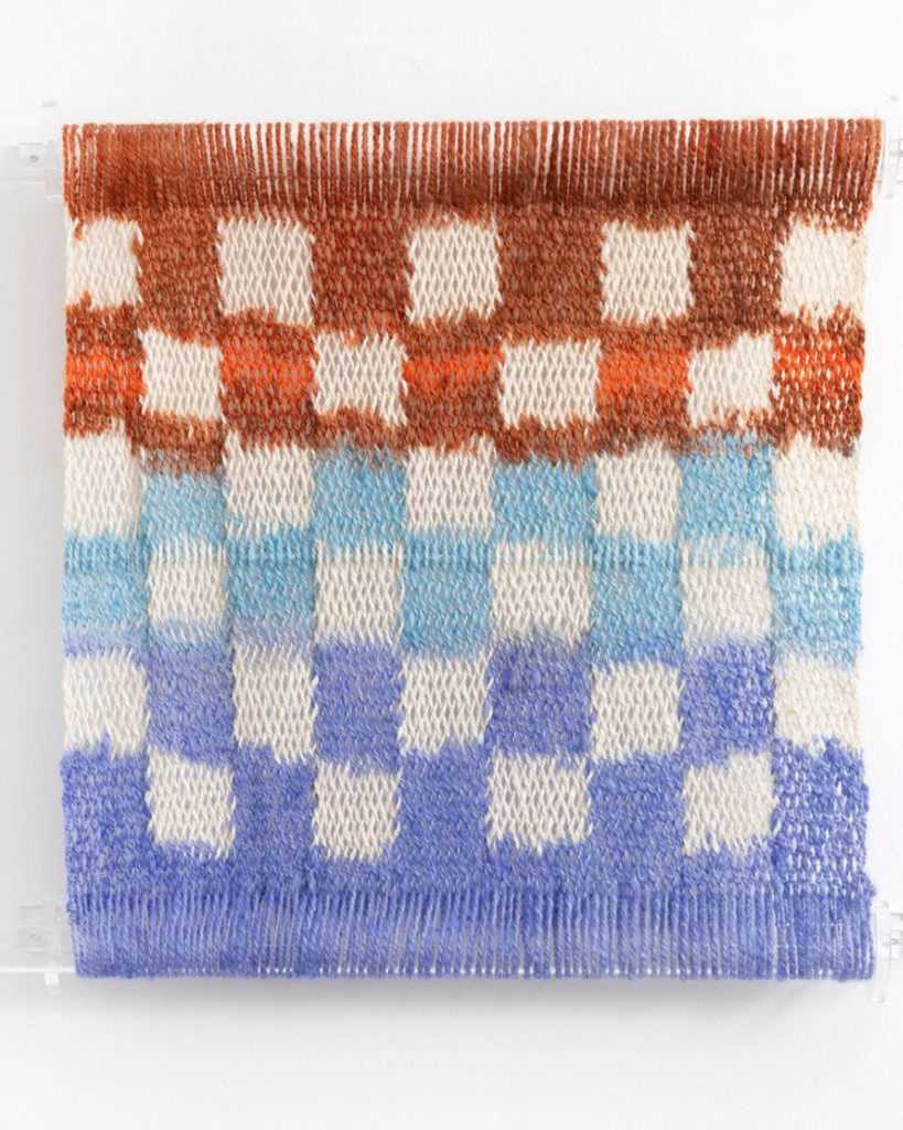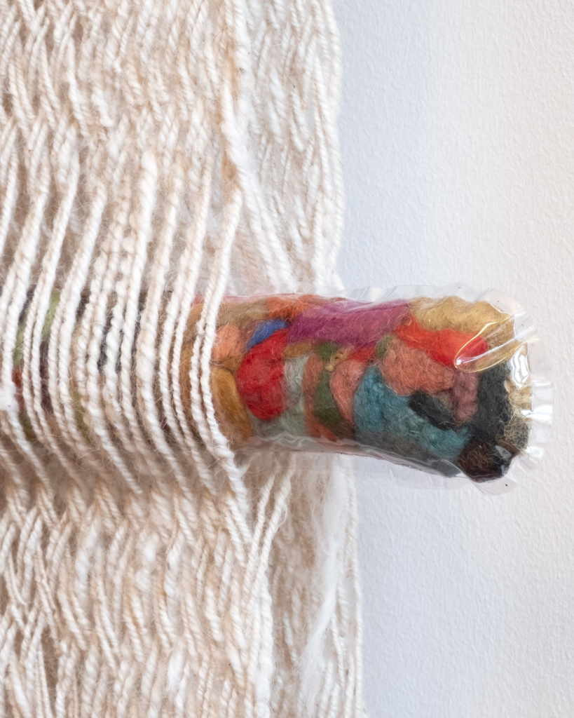 With a Master of Fine Arts from the Oslo National Academy of the Arts, Saksi primarily uses the Sprang technique, an ancestral braiding method that allows her to construct textile surfaces displayed on walls or installed in environments. The pieces are fixed with plastic structures in various formats, creating stretched weaves that explore the interaction between vibrant colors and natural tones. The color palette is inspired by four specific sheep from her flock — Alli, Majlis, Lea, and Salme — complemented by white wool dyed with synthetic colorants from her parents’ flock in Sweden.