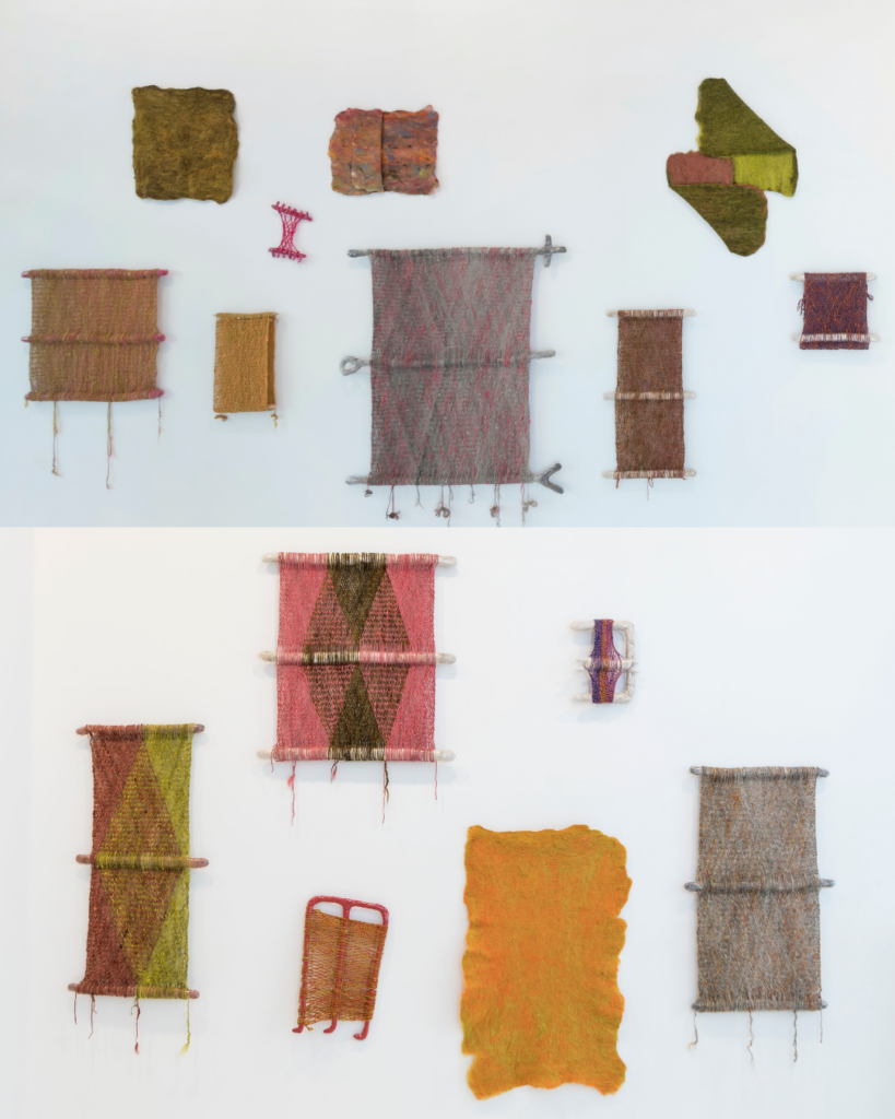 Saksi’s creative process encompasses hand-spinning, dyeing, and weaving. “From the moment the wool is sheared, it is my hands that shape it, touching every millimeter along the way,” she states. This proximity allows her to control the character of the wool, preserve its natural properties, and incorporate irregularities as part of the artistic expression. The result is chromatic variations that contrast strong colors with earthy tones, creating visual energy while the presence of wool brings coziness to exhibition spaces.