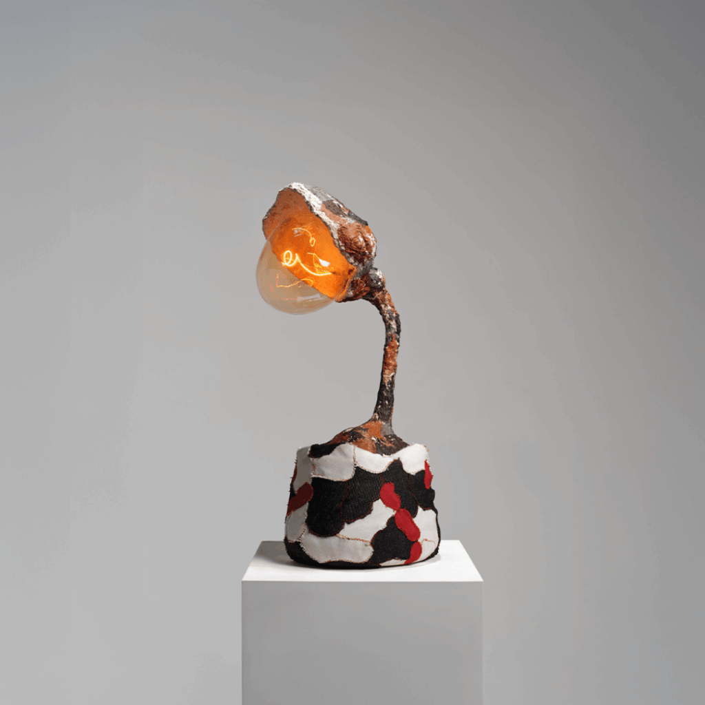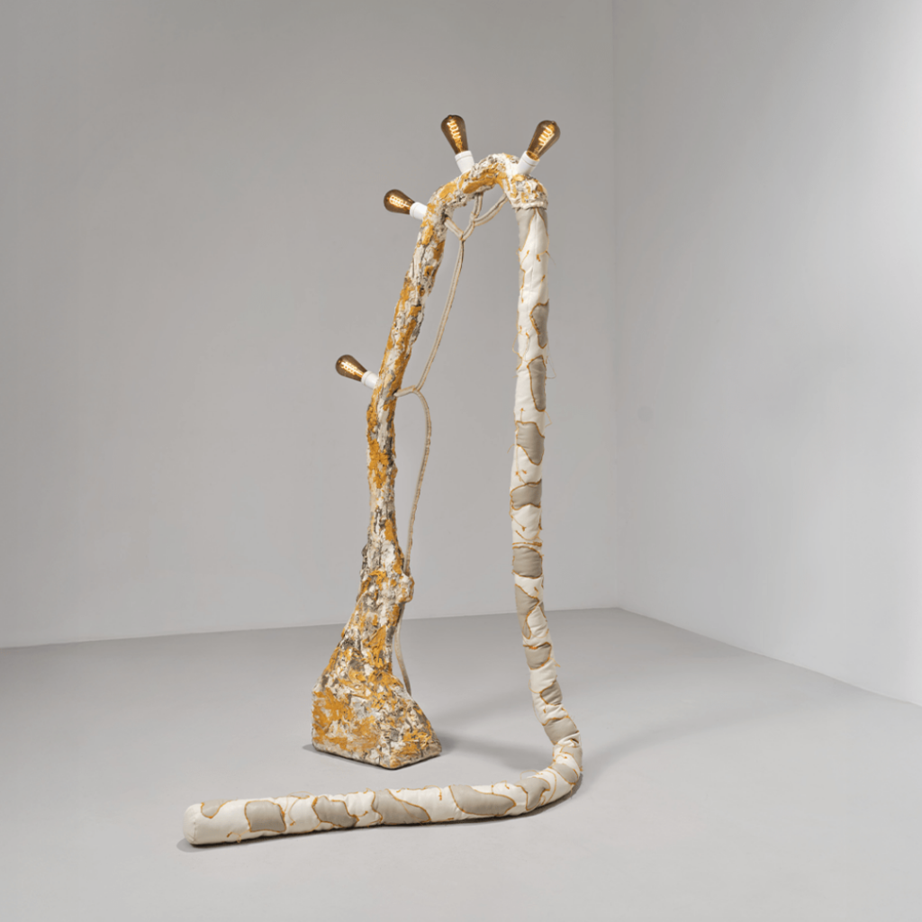 The Babbasone lamps feature a textile base that allows users to bend and tilt the structure. With each movement, the direction of light and the spatial configuration of the object change. Available in two sizes, the pieces combine the rigidity of plaster and metal with the flexibility of leather.