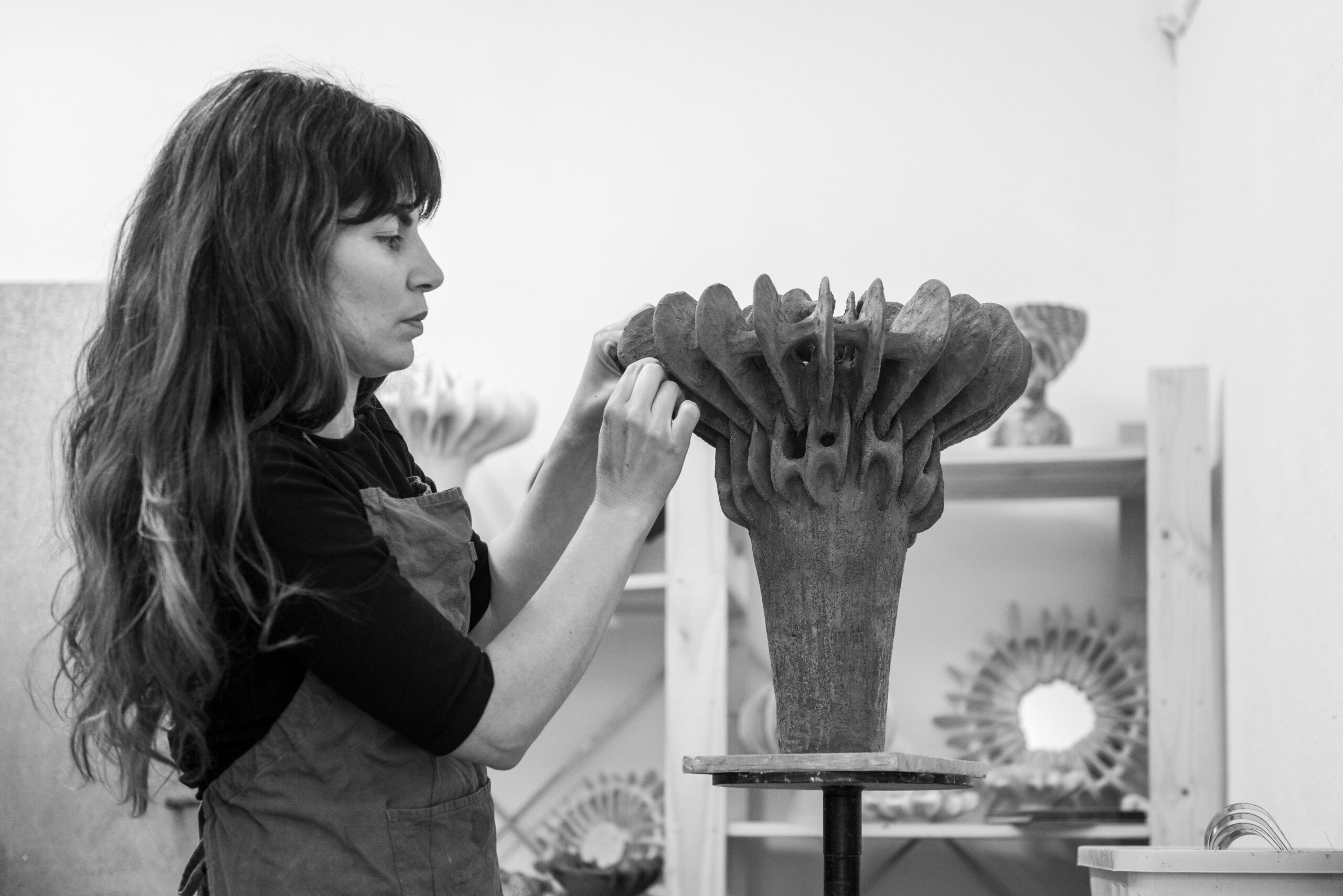 A cornucopia that no longer yields abundance, but thorns and bone fragments. That is the image Greek ceramicist Kallia Panopoulou, uses to capture the breakdown of humanity’s relationship with nature. Trained in product design at Central Saint Martins in London, she walked away from the rationality of industrial design to devote herself to clay and, in fewer than five years of running her own studio, has placed her work in galleries in Milan, Paris, London, and Brussels, while collaborating with architects on projects for luxury resorts across the Greek islands.