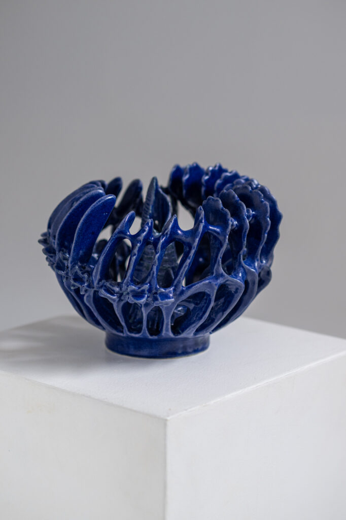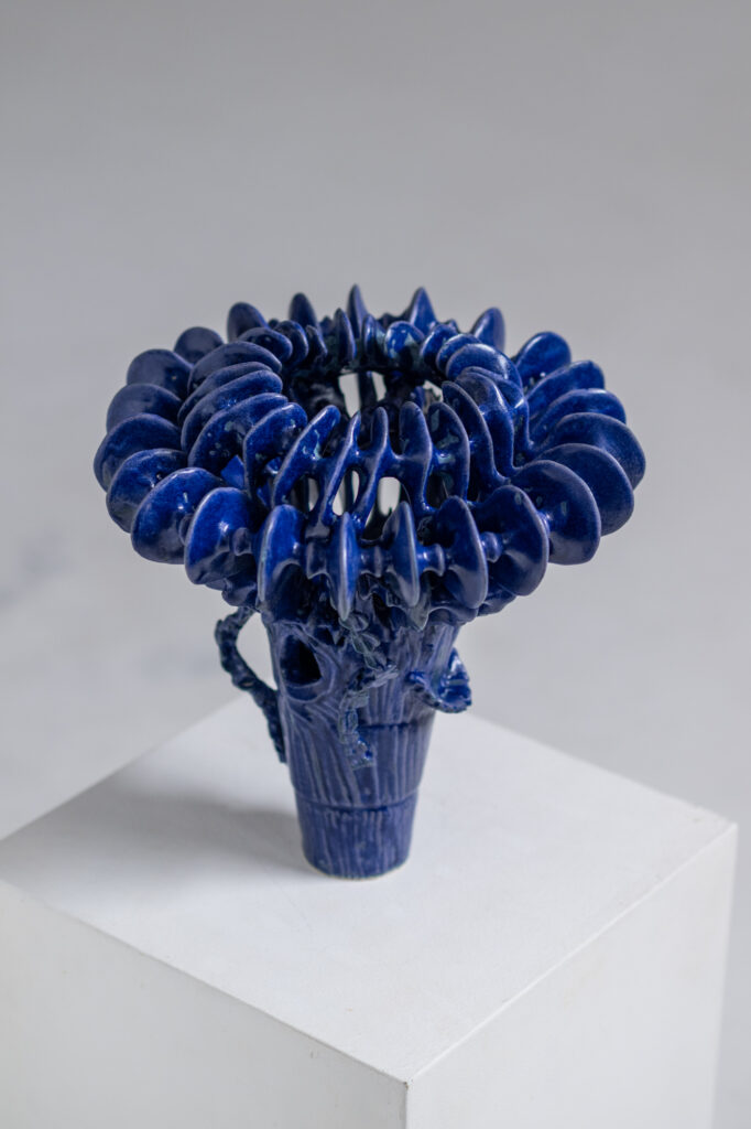 What sets Panopoulou’s work apart is not only technical skill or formal originality. It is the conceptual consistency of a practice that unfolds like a living organism. Each series grows out of the one before it, expanding both conceptually and technically. The “Horn of Plenty” series, from 2023, reinterpreted the mythological symbol of Amalthea to examine the contemporary relationship with abundance and consumption. “The Last Bloom,” from 2025, deepened that critique by introducing the cobalt blue palette and bone imagery, making the ecological argument more direct.