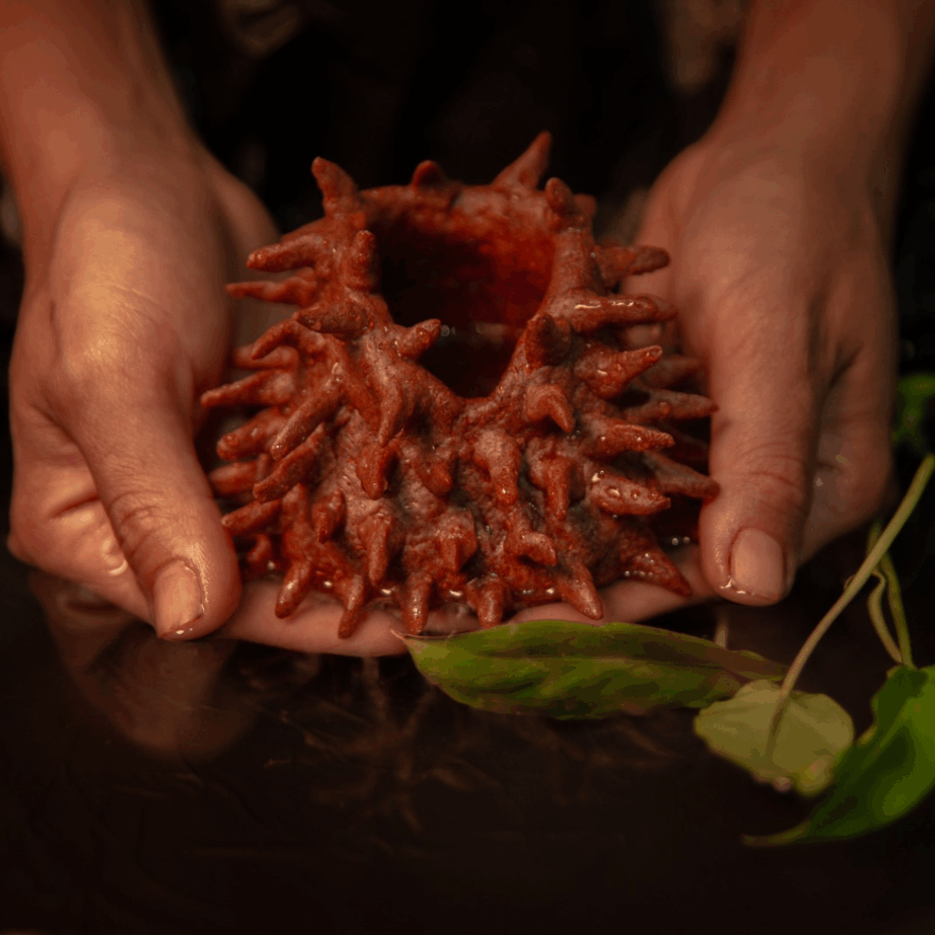 The Espinhal line exemplifies the studio’s approach. Inspired by the paineira tree, marked by the thorns that cover its trunk, the collection explores the role of these elements in nature as symbols of defence, protection and resistance. The pieces mimic organic forms and translate the presence of thorns into matter, texture and gesture.