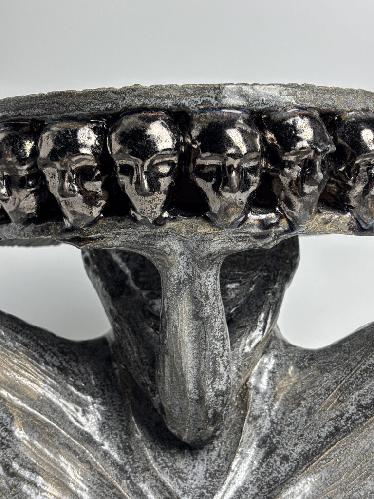 “Crown” (2025) — 56 × 35 × 18 cm. A crown of figures in dark clay with silver glaze. Photo: Vitaliy Krasutskyy
