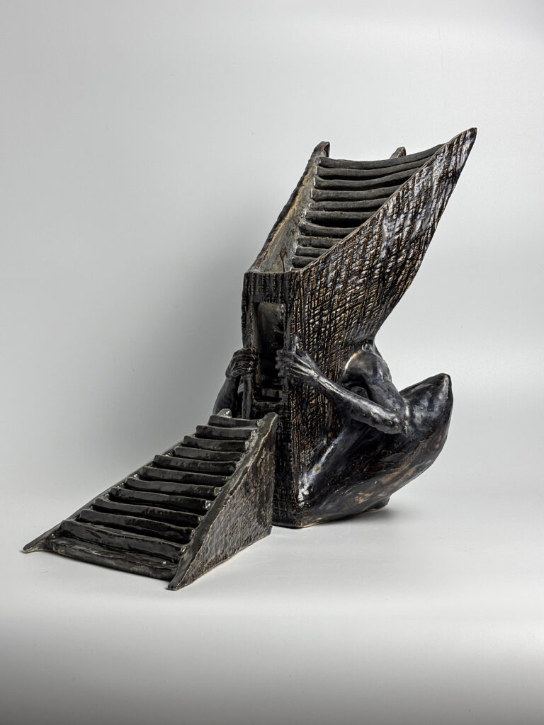 “The Path” (2025) — 40 × 25 × 30 cm / 20 × 20 × 10 cm. Two-element sculpture: a human figure before a staircase that folds back on itself, in chamotte clay with black glaze. Photo: Vitaliy Krasutskyy