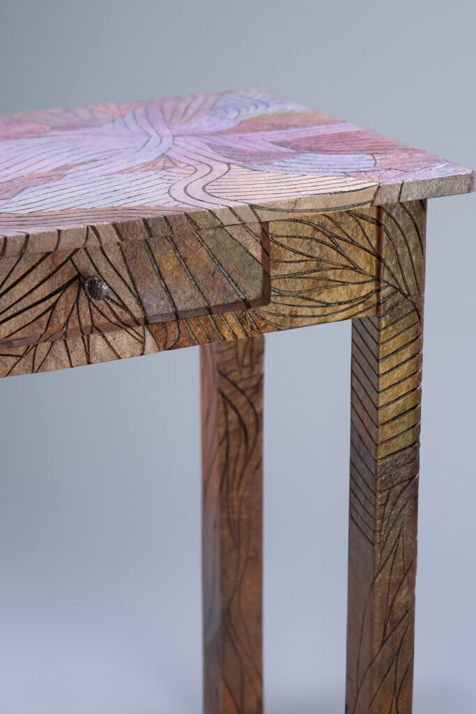 Kami-Kami’s applications extend across different segments of design and architecture. The material has already been developed for wall coverings, woodworking and marquetry, collectible design, furniture, lighting, packaging, and custom projects for designers, architects, and cultural institutions. The hybridization of artistic practice and technical expertise is precisely what sets Demir’s work apart on the international stage: she not only produces unique pieces but has also systematized a reproducible process that opens the door to industrial and commercial applications.