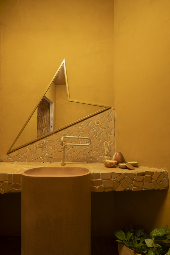 A wash of intense yellow in the powder room evokes the Pará sun and the humid warmth of the rainforest. A raw clay sink, a triangular-cut mirror, and a neon sign spelling ‘the sky’ across the ceiling come together in a composition that mixes craftsmanship, wit, and visual poetry. Every detail was chosen to provoke an immediate sensory reaction, expanding the experience well beyond the functional.