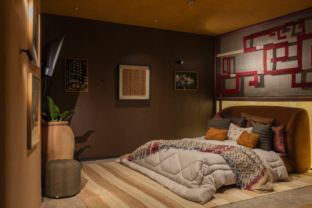 Bedroom featuring a Marajoara graphic pattern panel and a work of art from Pará in the background. Photo: Studio Tuca