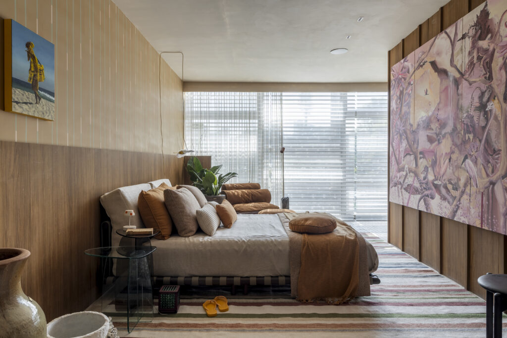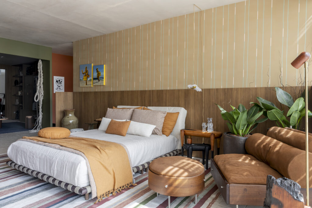 The bedroom’s warm palette — ochre, caramel leather, and striped woven rugs — translates Rio’s domestic ease into material form.Photo Rafael Renzo
