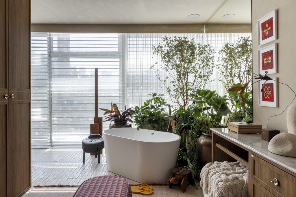A freestanding tub surrounded by Atlantic Forest species dissolves the boundary between interior and landscape in the bathing area.Photo Rafael Renzo