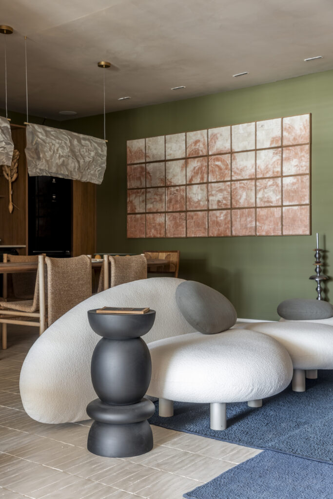 The social area’s organic bouclé sofa and dark sculptural side tables against the olive-green wall with a panel of terracotta tiles.Photo Rafael Renzo