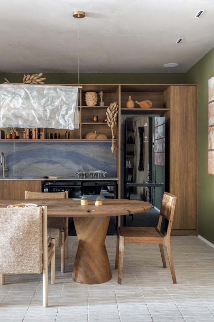 The kitchen centers on a solid wood round table by Areka’a, alongside custom cabinetry and a blue-toned stone backsplash. Photo Rafael Renzo