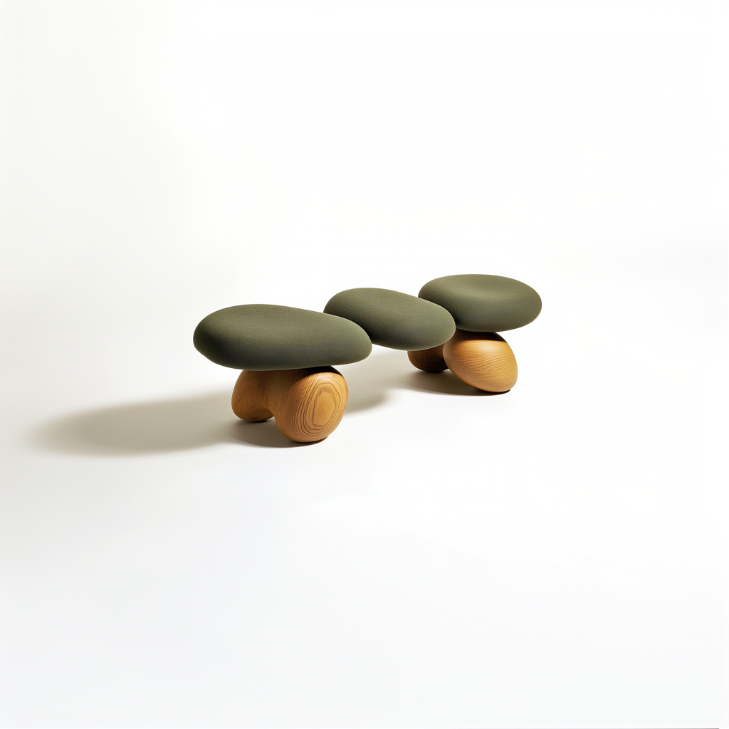 Igor Lima’s work dialogues directly with these concepts. Even geographically distant, the designer maintains a strong bond with the Amazon by using hand-carved solid wood, favouring noble materials from the forest and artisanal processes that value traditional knowledge. The Tataui table, with organic forms that suggest metamorphosis, and the Pedras bench, with upholstered seats in shades of green on a carved base, demonstrate this commitment to local raw materials and techniques that respect natural cycles.