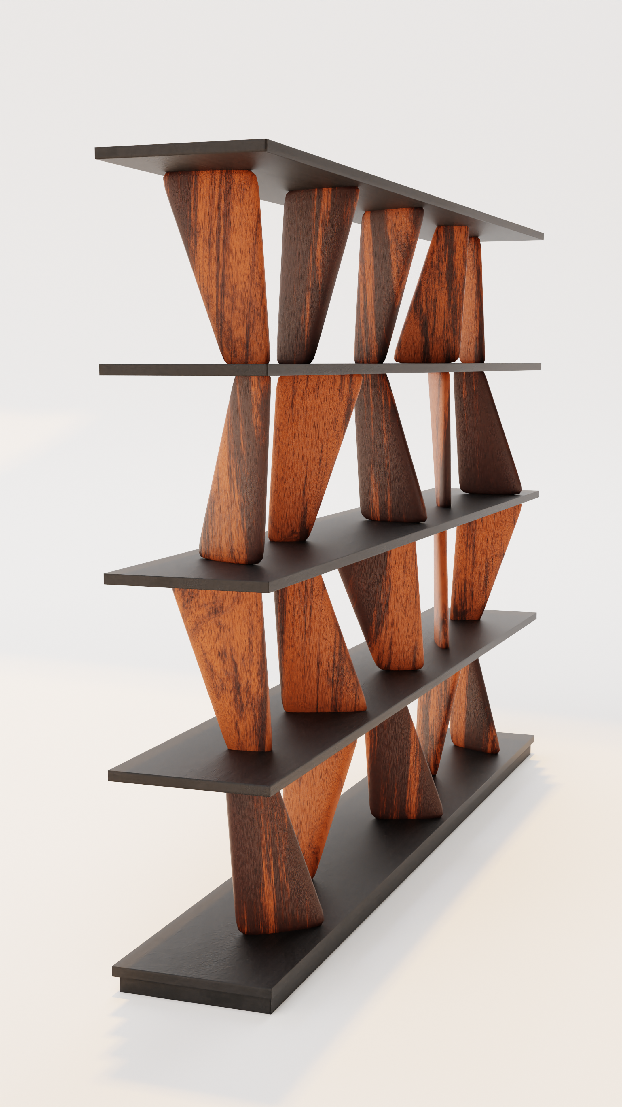 The Tajapi shelving unit, which won the IBEMEI Design Award, demonstrates how authorial design can project regional identity beyond geographical boundaries. With thin shelves in dark tones and supports in solid wood with a trapezoidal shape, the piece translates indigenous graphics into contemporary language.