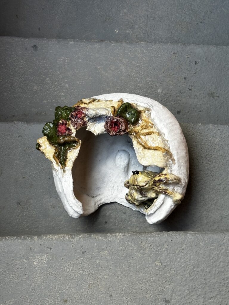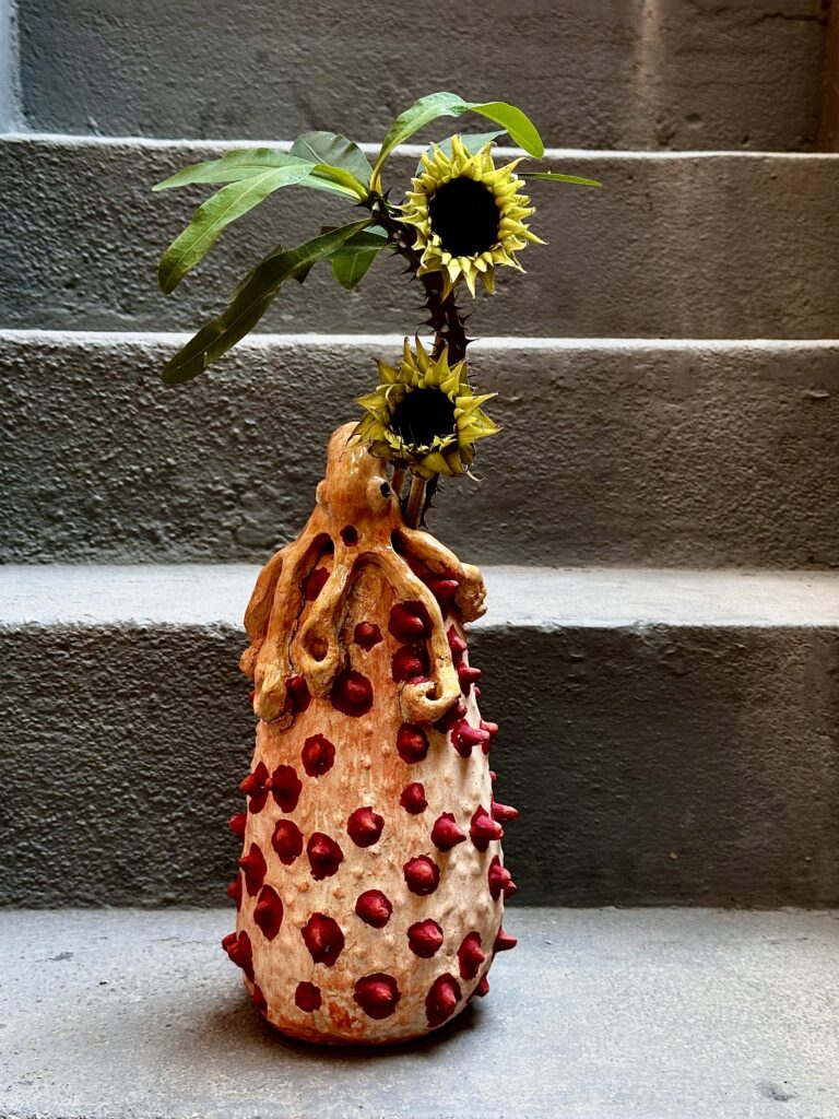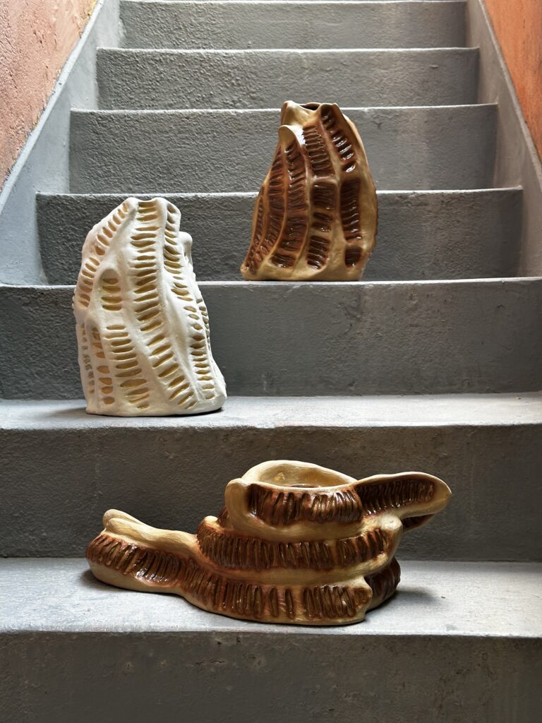 The ceramist works with firing at different temperatures and explores techniques such as raku, developing pieces that question human imperfection and environmental impact. ‘It is inevitable that these materials will return to nature, but is there a limit to their germination?’ she asks in her artistic manifesto, reflecting on transformation and impermanence.