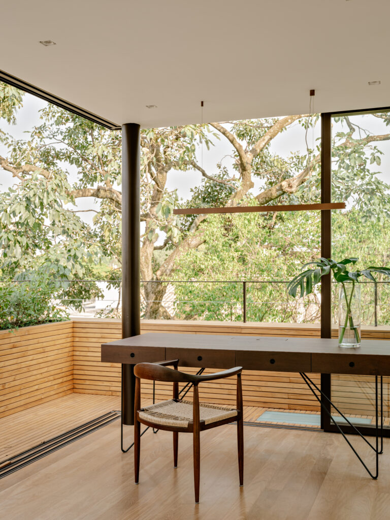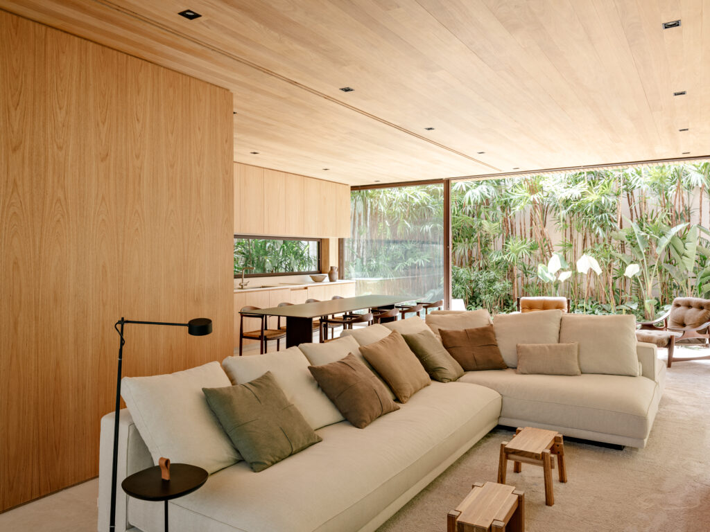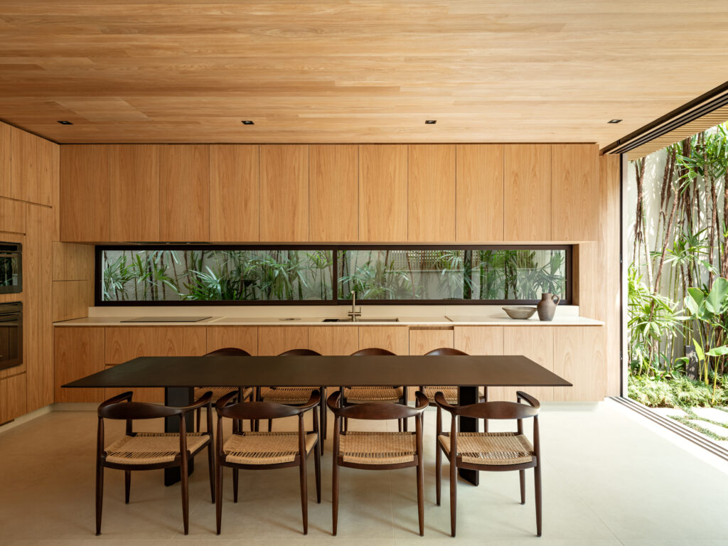 The landscaping, designed by Rodrigo Oliveira, completes the composition with tropical vegetation that creates a visual barrier and reinforces the sense of privacy. The project involved architects Beatriz Fujinaka, Stephanie Wolff, Andressa Sato, Caroline Zaleski, Raquel Sales and Rebeca Petravicius.