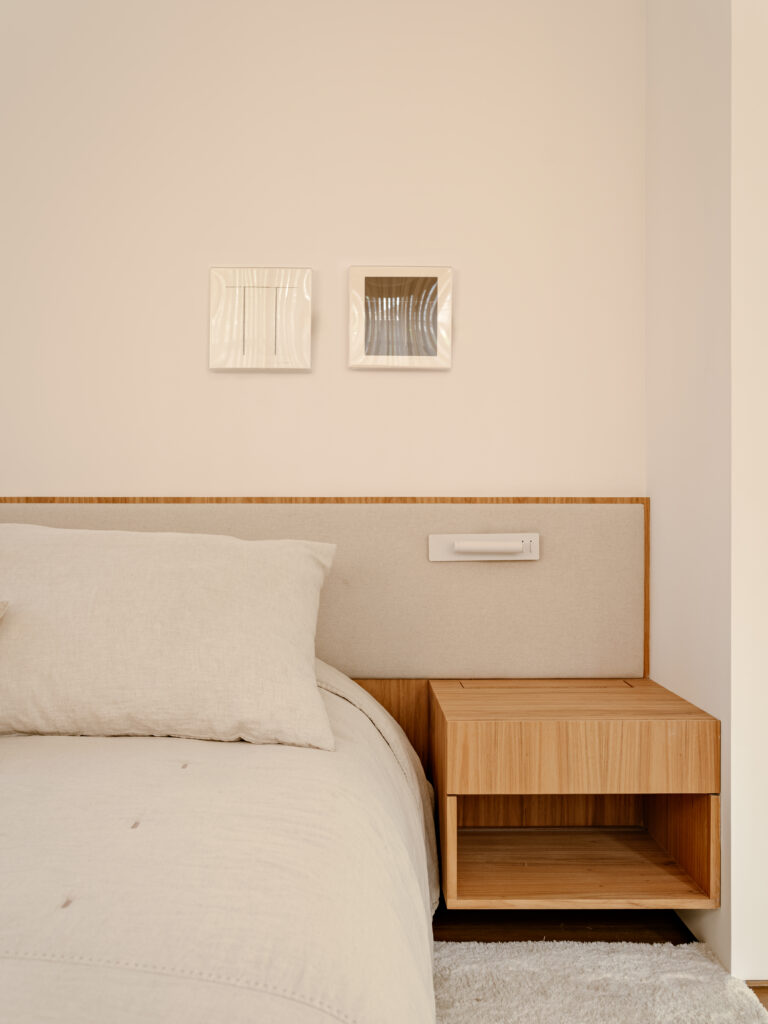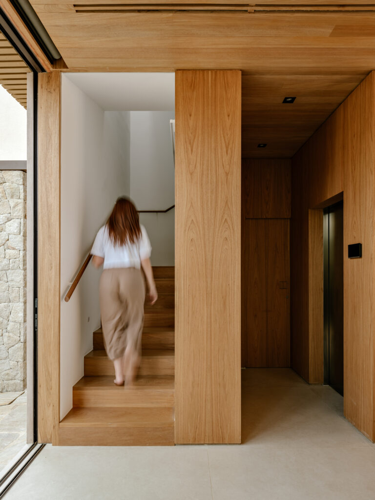 Accessibility issues guided the project from the outset. Wide passages and a lift ensure circulation between floors. The choice of materials prioritised durability: porcelain tiles, Dekton worktops and timber in panels and furniture dialogue with natural stone in external walls and paving.