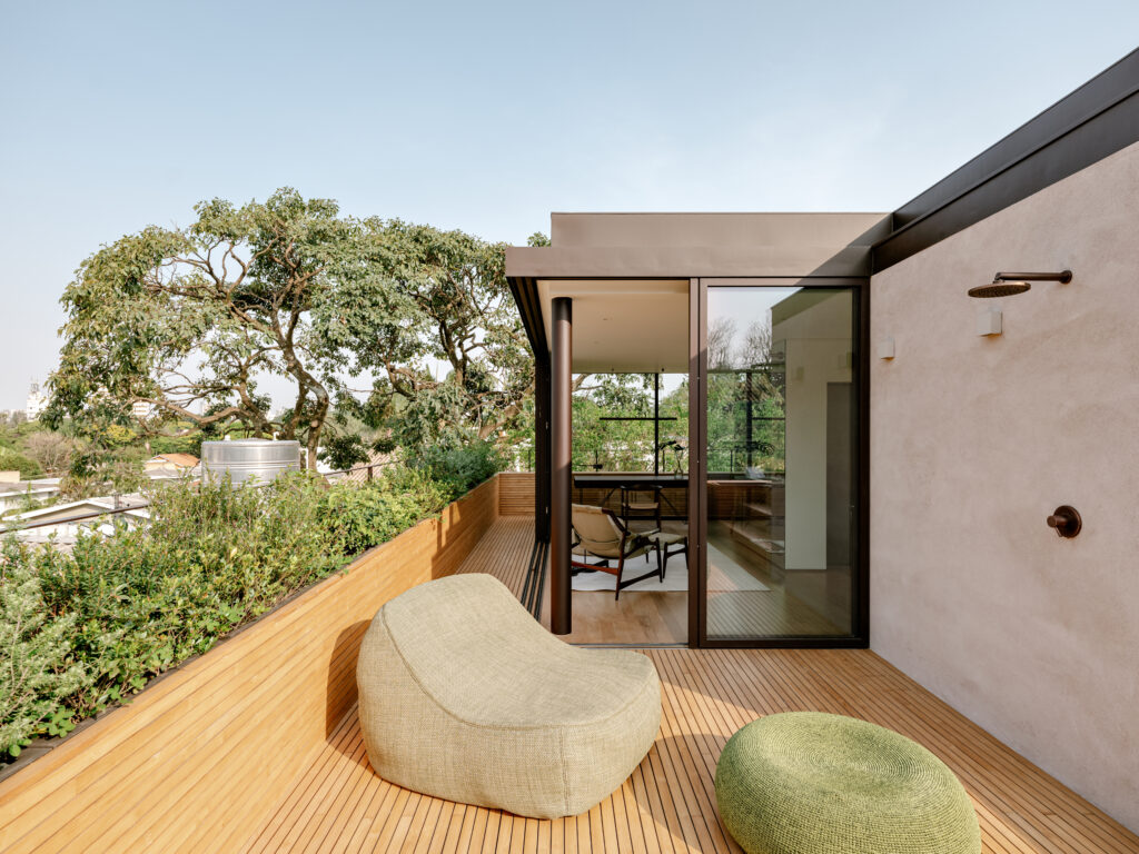 The distribution of spaces privileges the owners’ social lifestyle. The ground floor houses an integrated kitchen and living room, which expand towards the garden. The first floor concentrates two en-suite bedrooms. The rooftop offers a multipurpose room and deck with views over the treetops of the leafy neighbourhood.