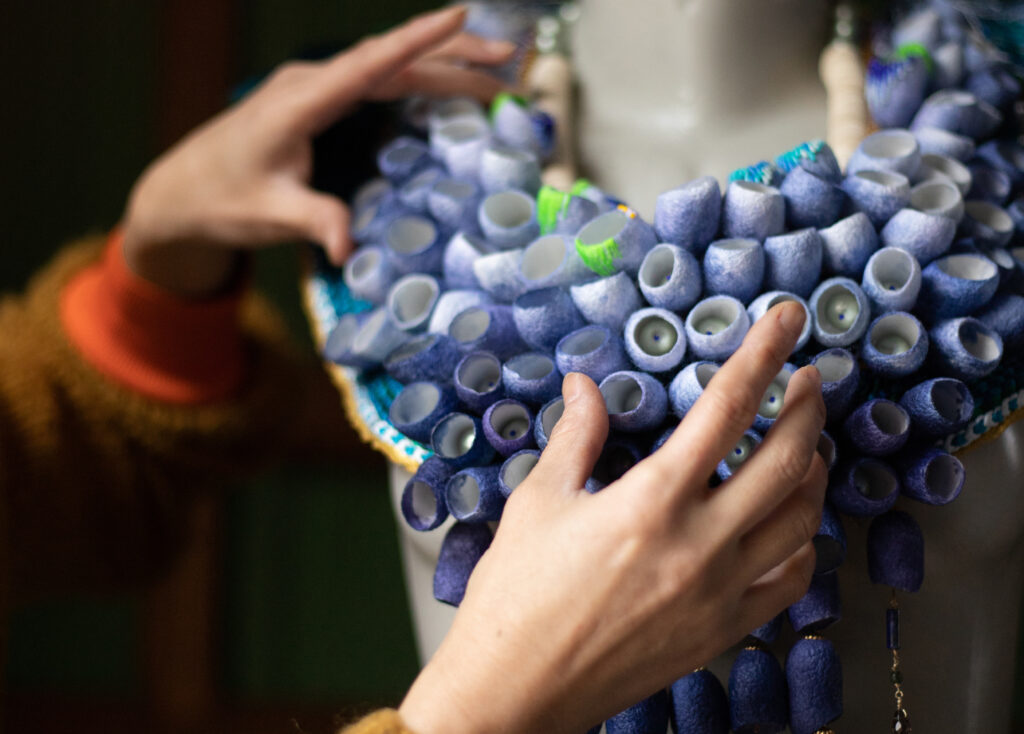 Briandet’s work stems from a defined purpose: to use “forgotten” materials and knowledge to revive ancestral practices and project them into the future. In this spirit, the artist combines her jewelry with imposing sculptures that incorporate large quantities of precious cocoons.