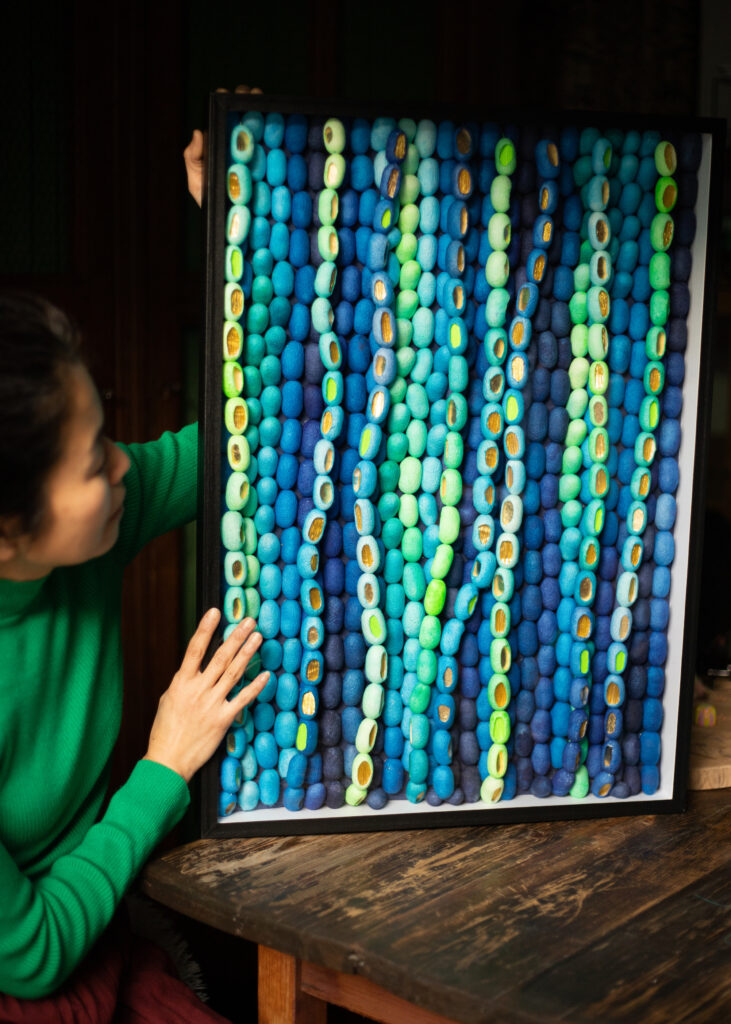 Briandet’s choice of this specific material goes beyond aesthetics. Tomioka silk represents a tangible symbol of the cultural fusion that defines her own artistic journey – born in Japan, trained in Eastern techniques, based in France, and inspired by European artisanal tradition.