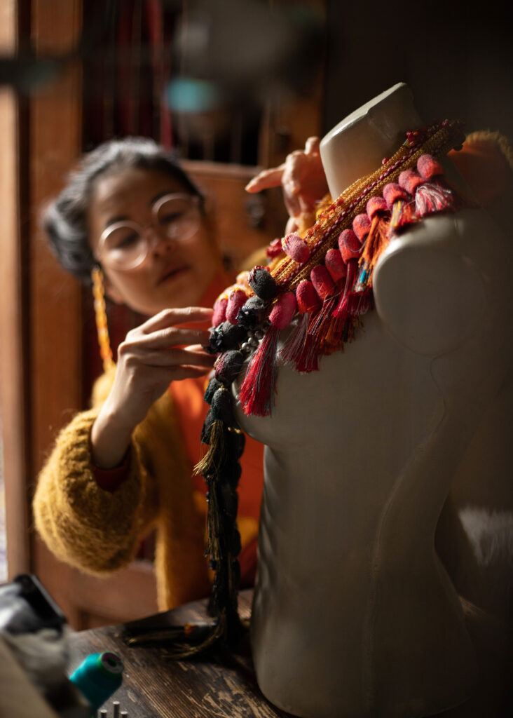 “Kumihimo is a true source of inspiration for my projects,” says Briandet. “The combination of raw materials, such as natural cocoons, with the artisanal refinement of braiding creates a dialogue between the organic and the elaborate, between the spontaneous and the meticulous.”