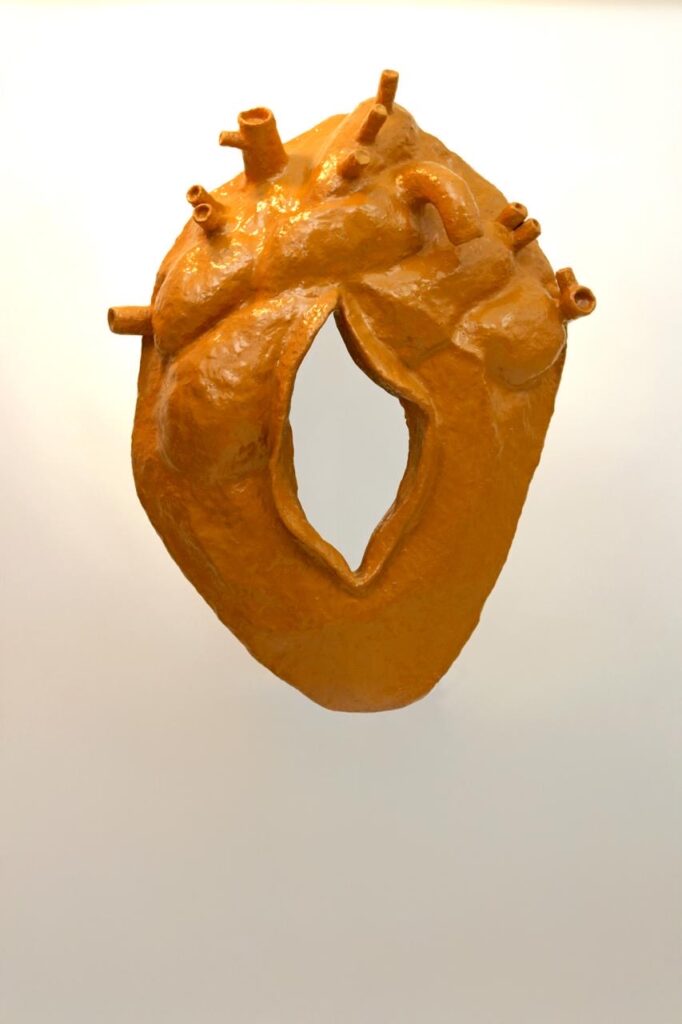 The representation of a human heart in intense orange, with veins and arteries modelled in relief, stands out for its anatomical literalness combined with sculptural treatment. Hung like an object of devotion or biological trophy, the organ gains a symbolic dimension that moves between science, religiosity and pop culture—a perfect synthesis of Vieira’s aesthetic proposal.