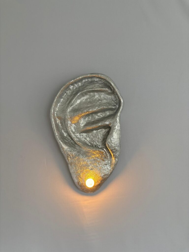 The irregular texture of papier-mâché, visible on the surfaces, reinforces the handcrafted character and gives the sculptures a tactile quality that contrasts with the shine of enamelled paints. Another notable work is a silver ear with illuminated golden details, mounted on the wall like a contemporary reliquary. The piece transforms an organ of perception into an object of contemplation, inverting the function of hearing into something to be seen and admired.
