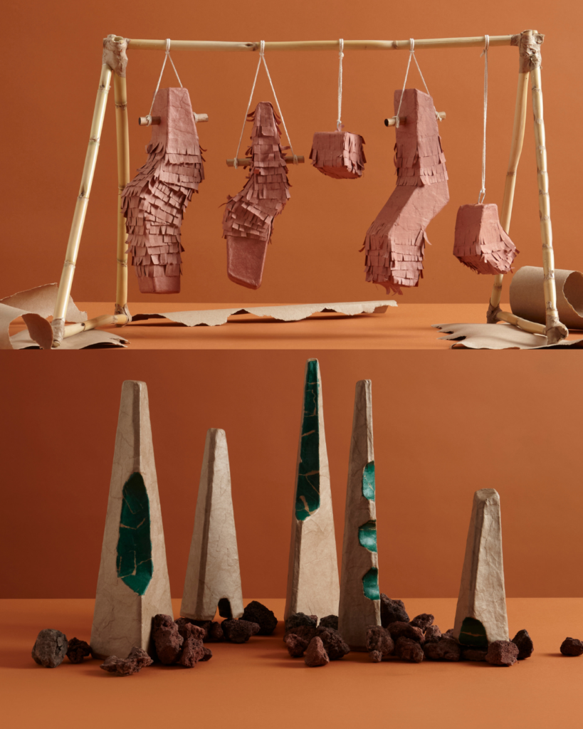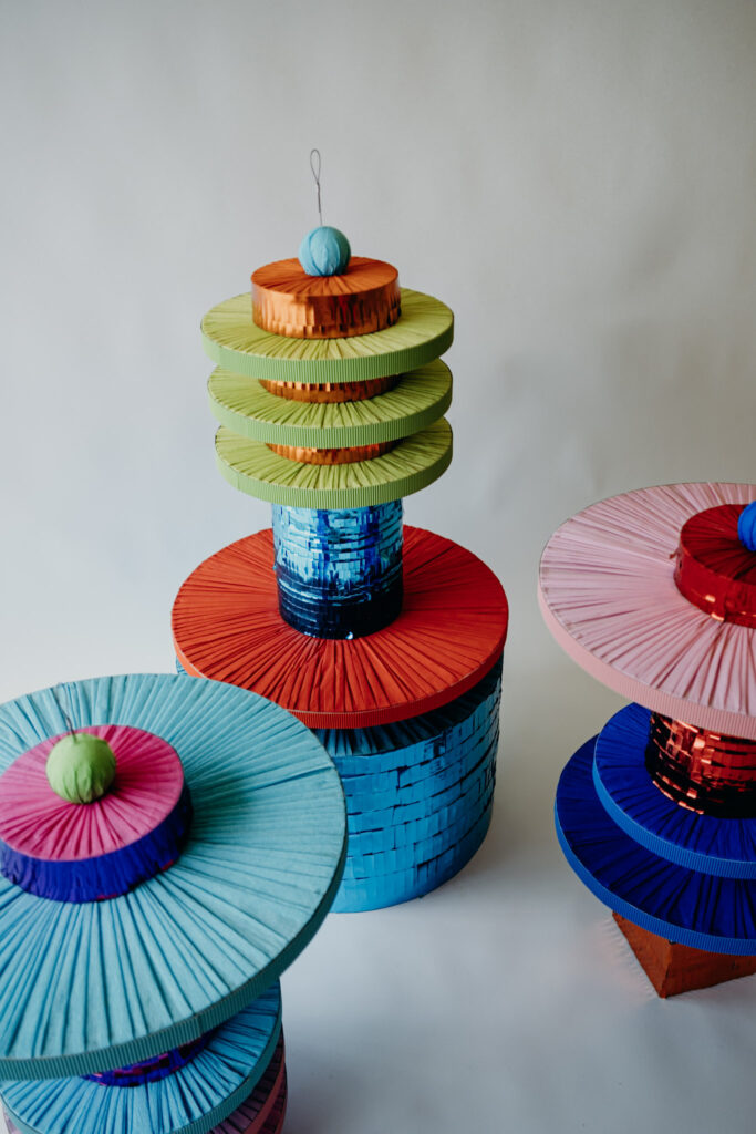 The central element of Lascurain’s explorations is the piñata, a paper object present in Mexican celebrations, especially children’s parties. The artist proposes taking it from childhood and bringing it into adult life, from a more mature and nourished place. The piñata is understood not only as a toy but as an almost ritualistic element of celebration, loaded with cultural symbolism.