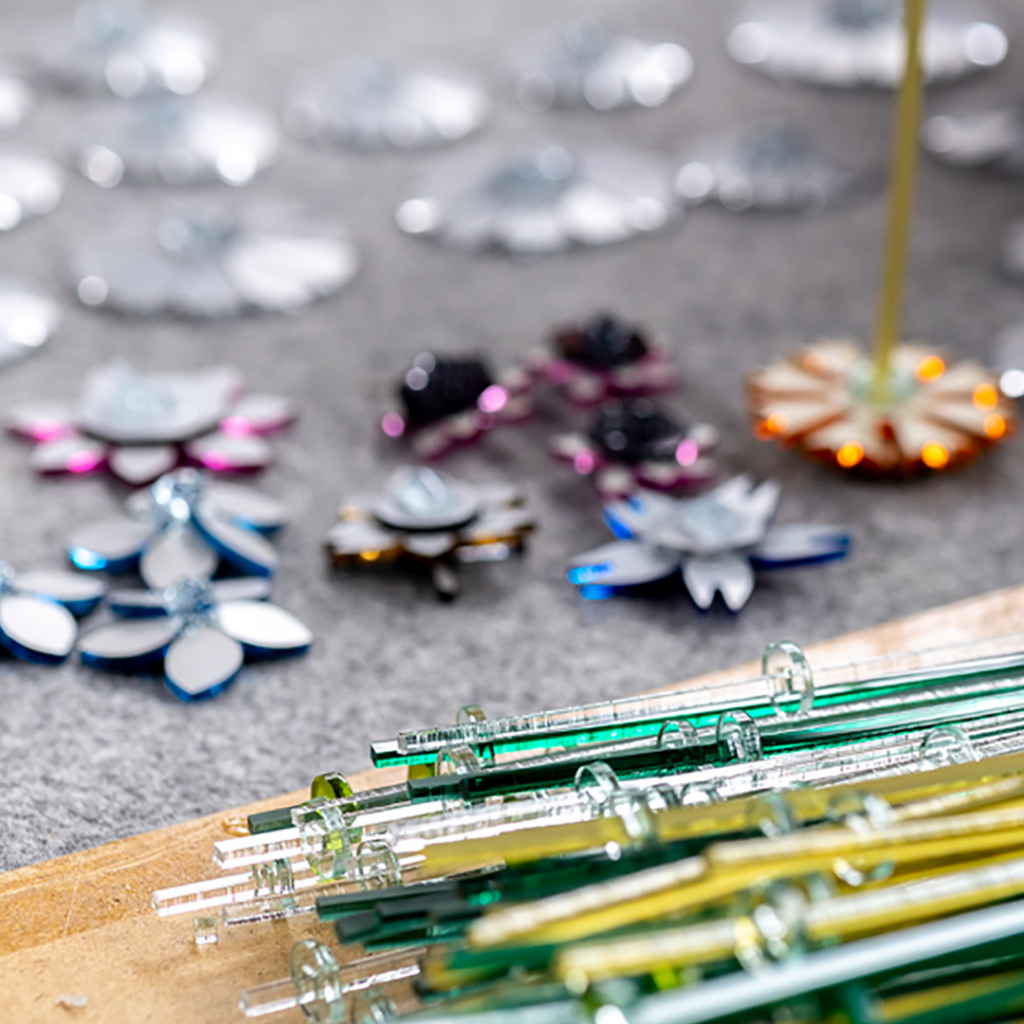 Much of the products are made from acrylic waste collected by the company PyraSied Xtreme Acrylic. Individual shapes are laser-cut from 3-millimetre waste acrylic sheets, generating no waste.