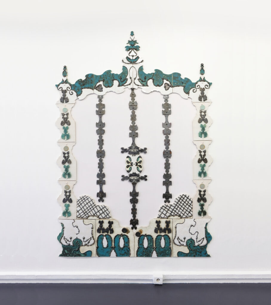 The artist explores concepts of passage and threshold through sculptural forms combining architectural and vegetal elements. Her bas-relief doors and gateways merge formal rigor with organic motifs inspired by Art Nouveau and 17th-century jewelry, where ornament becomes structure.