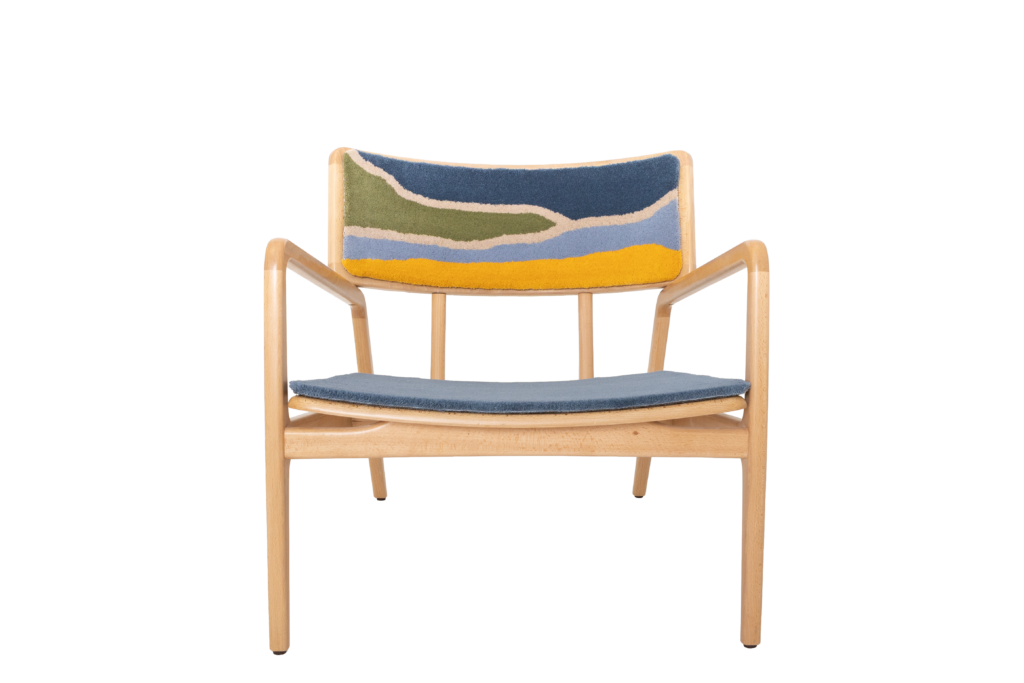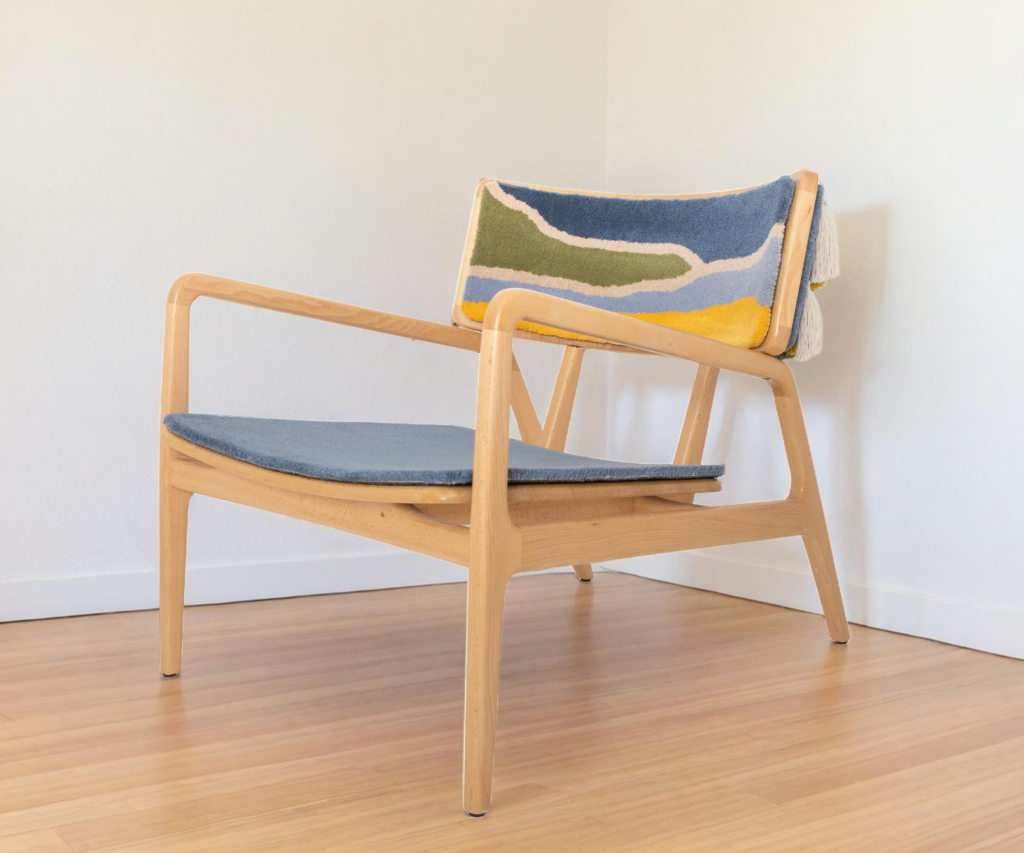 Rondinart produced the chair’s structural base, applying traditional Portuguese carpentry techniques through proportion, solidity, and formal elegance. The wood serves as a foundation that allows for the harmonious integration of textile language.