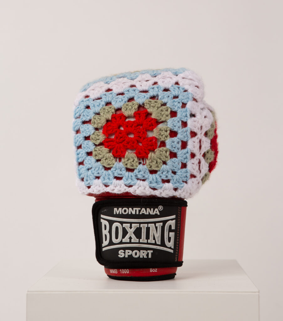 The artist uses a technique historically linked to intimacy and the domestic environment to intervene in objects associated with spectacle, function, or authority. A soccer ball remains a soccer ball. A chair remains a chair. But their symbolic charge shifts. The objects, softened but not neutralized, oscillate between vulnerability and resistance.